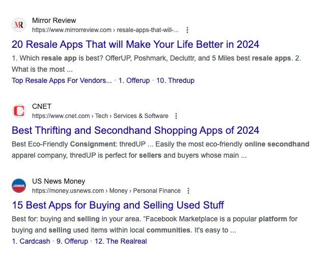 Say we want to find companies similar to Thrifthouse, a platform for selling secondhand goods on college campuses. Unfortunately, googling “companies similar to Thrifthouse” doesn’t do a very good job. Traditional search engines rely heavily on keyword matching. In this case we get results about physical thrift stores. Hm, that’s not really what I want. Let’s try again, this time searching based on a description of the company, like by googling “community based resale apps.” But, this isn’t very helpful either and just returns premade SEO-optimized listicles…