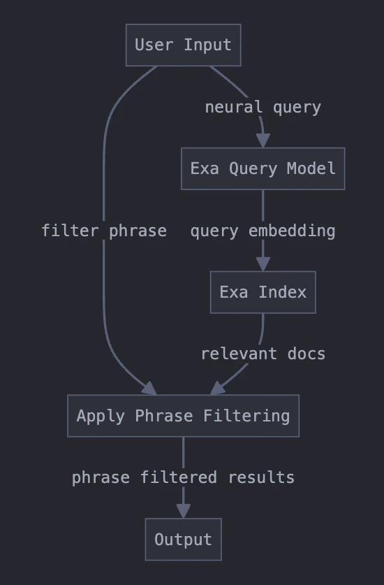 Exa’s search combines semantic relevance with precise filtering: a neural query first retrieves contextually relevant documents, then a phrase filter refines these results by checking for specific text in the content. This two-stage approach delivers highly targeted outputs by leveraging both semantic understanding and exact text matching.